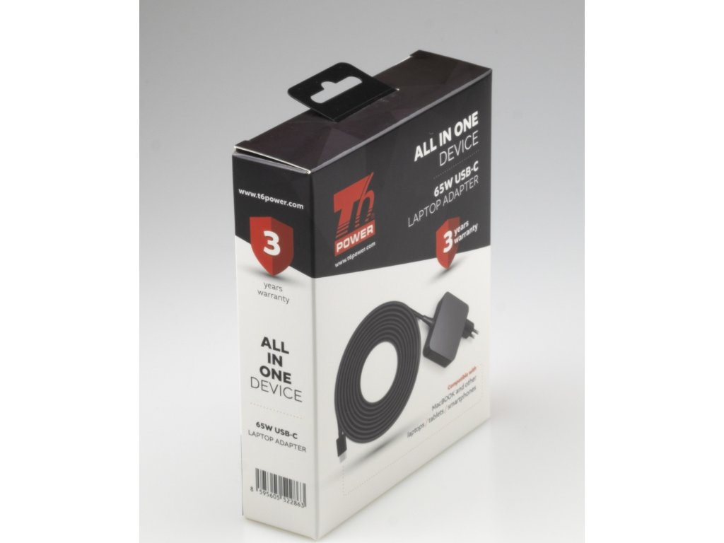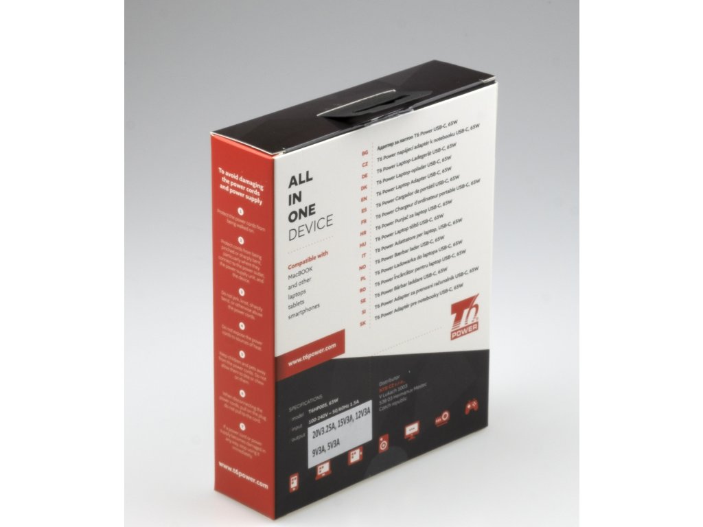 Univerzální adaptér značky T6 Power s výkonem 65 W je ideálním zdrojem energie pro notebooky, ultrabooky, MacBooky, tablety, mobílní telefony, monitory, atd.