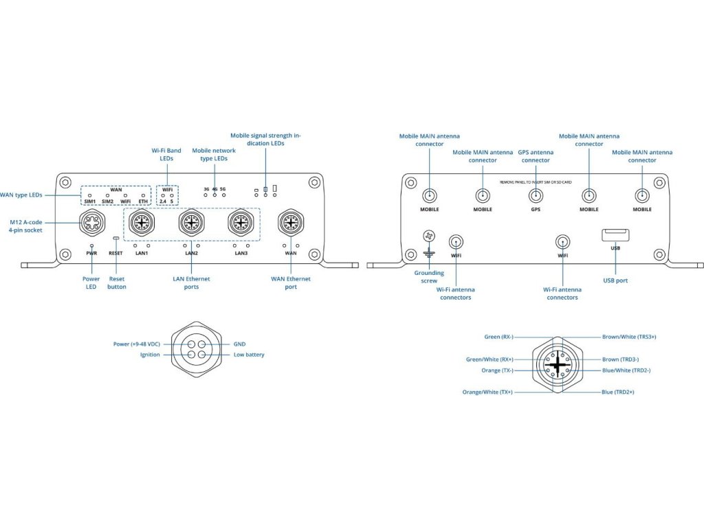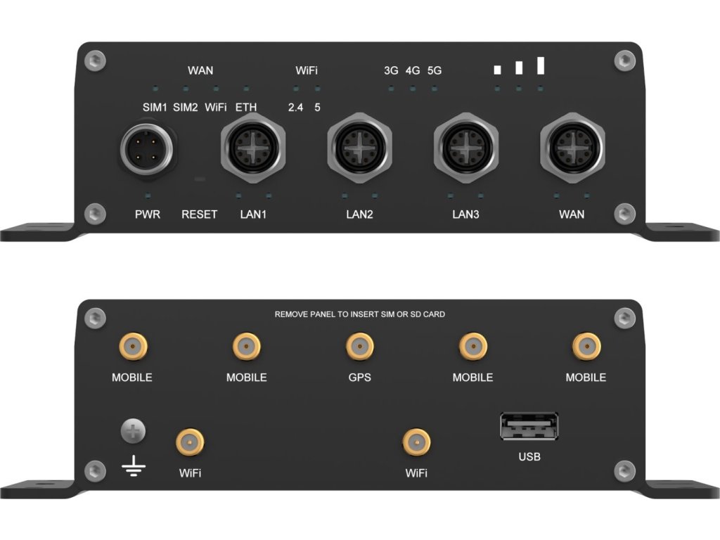 Router je vybaven systémem RutOS založeným na Linuxu OpenWRT, který podporuje průmyslové protokoly, VPN i pokročilé zabezpečení. Díky podpoře Teltonika RMS (Remote Management System) je vzdálená správa zařízení snadná a efektivní. Architektury SA a NSA umožňují flexibilní nasazení v různých 5G infrastrukturách, ať už závislých na 4G nebo čistě 5G. Montáž na DIN lištu a napájení v rozsahu 9–50 V DC přes M12 konektor dělají z tohoto routeru ideální volbu pro pokročilé síťové řešení v pohybujících se vozidlech i pevných instalacích.