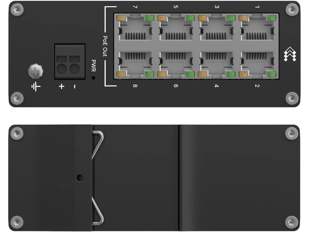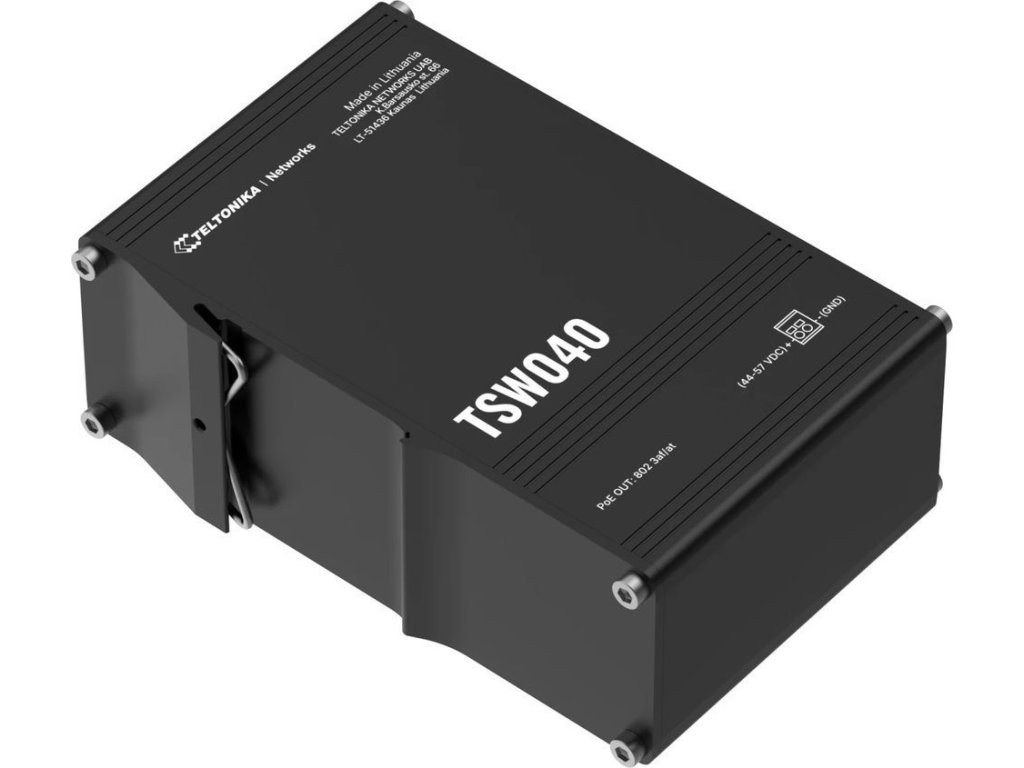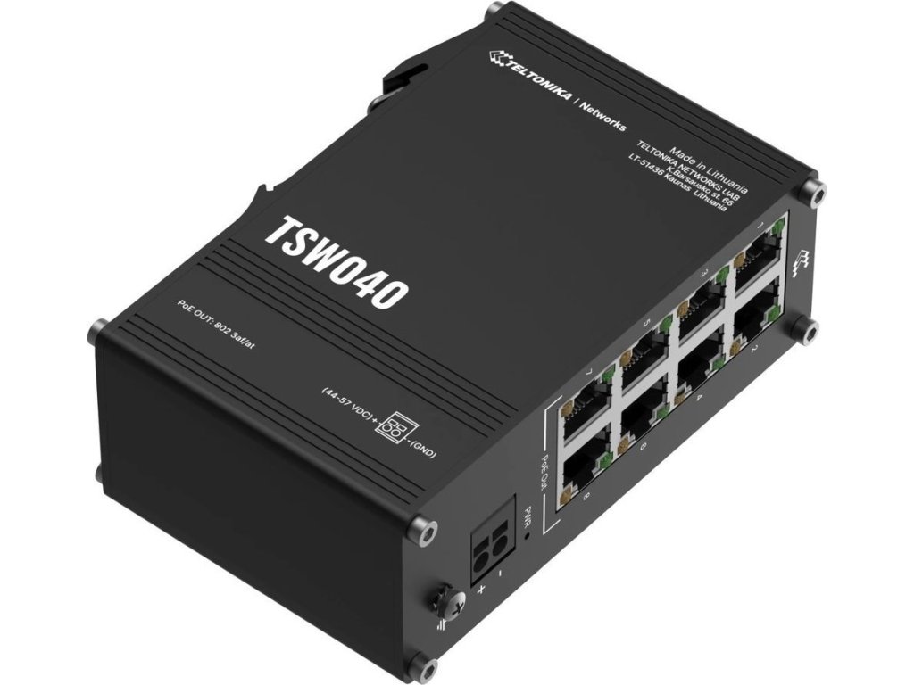 Průmyslový switch od Teltoniky nabízí 8x 10/100 Mbps LAN porty s podporou PoE, splňujícími standardy 802.3af/at s maximálním výkonem 30 W na port. Celkový PoE budget může dosáhnout až 240 W, což umožňuje napájení více zařízení současně jako jsou kamery, access pointy a jiné. Switch je navržen v robustním průmyslovém provedení s kompaktním hliníkovým tělem. Napájení je zajištěno přes DC svorkovnici s napětím 44 až 57 V DC, což zaručuje spolehlivý provoz i v náročných podmínkách. Balení neobsahuje napájecí adaptér.