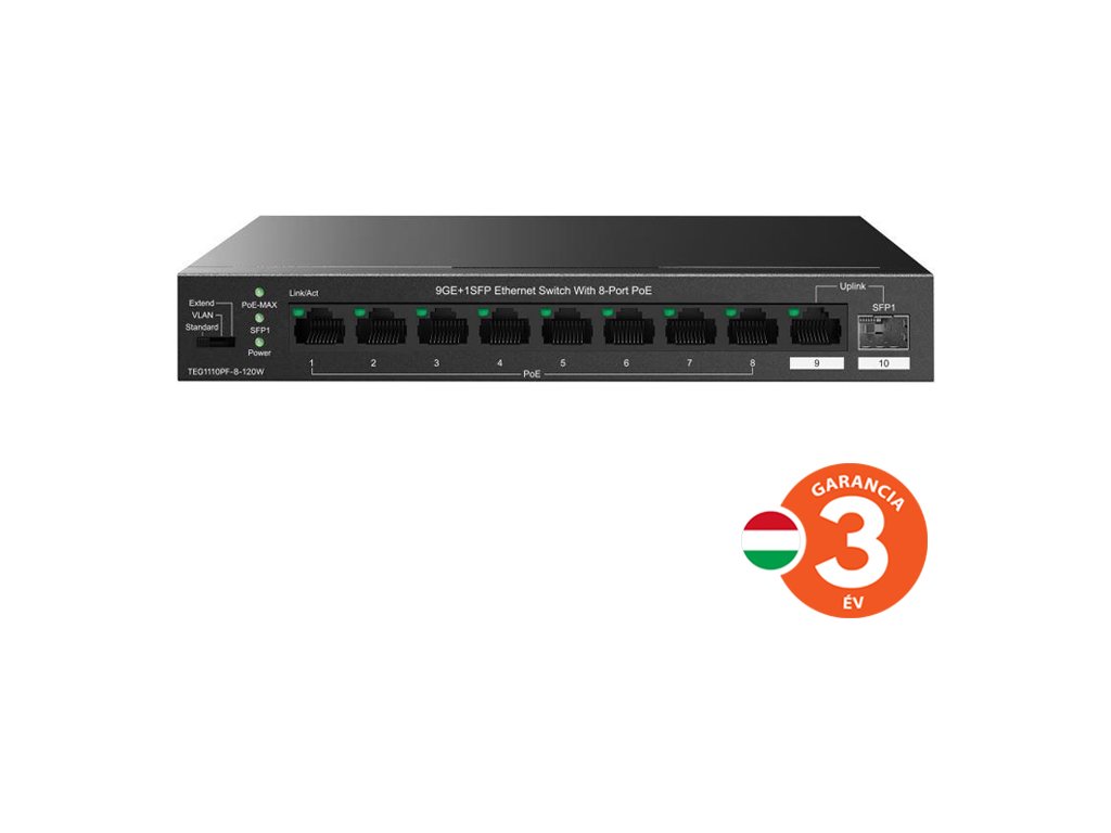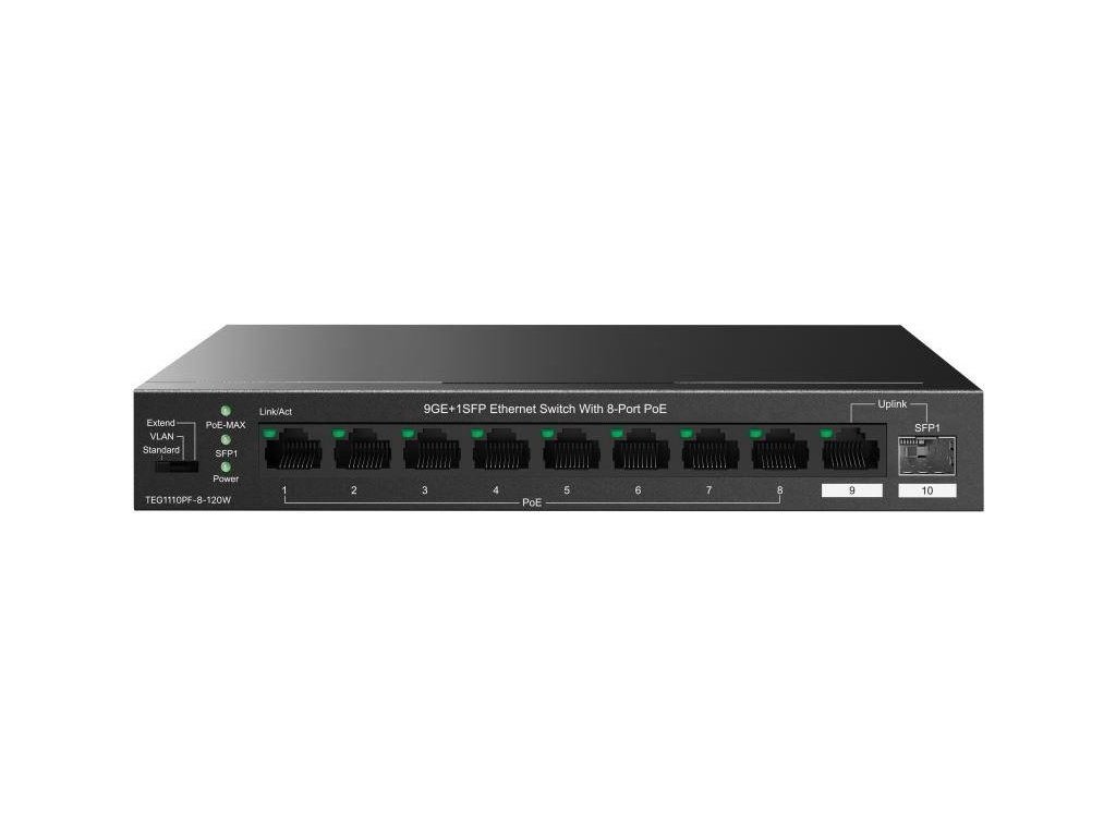 Tenda TEG1110PF-8-120W PoE+ AT switch 8xPoE 802.3af/at + Uplink RJ45 + SFP port, 110W, PoE+, fanless