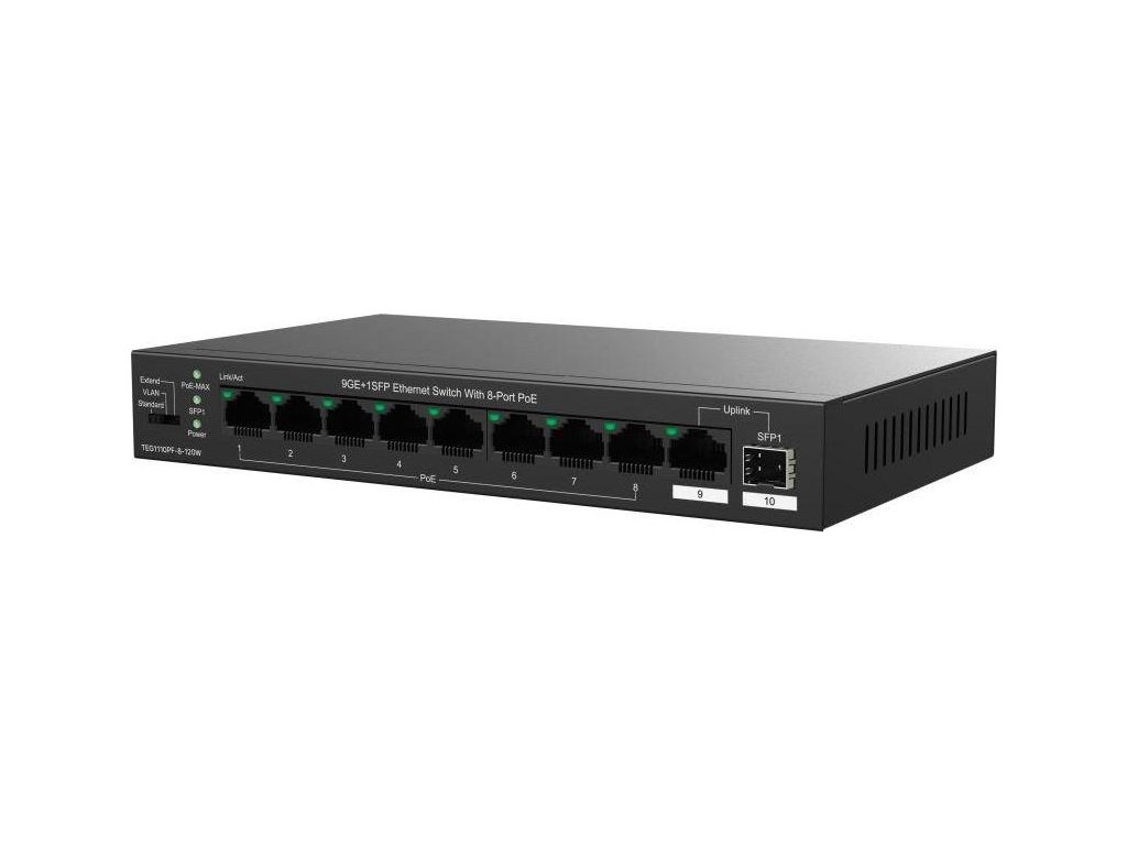 Tenda TEG1110PF-8-120W přepíná data pomocí 9 portů RJ45 a optického SFP slotu. 8 portů 10/100/1000 Mb/s podporuje napájení PoE802.3af/at, další 1 port RJ45 10/100/1000 Mb/s a SFP slot s rychlostí 100/1000 Mb/s jsou určeny pro Uplink. SFP moduly doporučujeme značky Signamax. Switch má ochranu proti přepětí 6kV. Podpora přepojování uzlů v módu Store-and-Forward. Full-duplex kontrola toku 802.3x, half-duplex kontrola toku v režimu Back-Pressure.