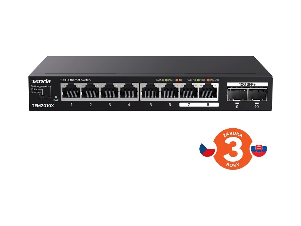 Tenda TEM2010X přepíná data pomocí 8mi portů RJ45 a 2x optického SFP+ slotu. 8 RJ45 portů 100/1000/2500 Mb/s a 2x SFP+ slot s rychlostí 100/1000/10 000 Mb/s. Switch má ochranu proti přepětí 6kV. Podpora přepojování uzlů v módu Store-and-Forward. Switch podporuje tři módy: Standart / VLAN / Aggregation.