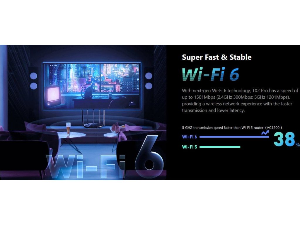Díky podpoře novějšího Wi-Fi standardu IEEE 802.11ax a navíc starších verzí IEEE 802.11ac/a/b/g/n je tento router univerzálním řešením vaší bezdrátové sítě. Chipset je nastaven v TX2 Pro tím způsobem, aby všech 5 externích všesměrových 6 dBi antén tvořily co největší a nejrychlejší pokrytí bezdrátové sítě, zároveň při nejvyšší rychlosti dle dané normy. To vše s inteligentním řízením chipsetu, spotřeby, a kvality služeb tvoří opravdový ideál i pro náročnější uživatele. TX2 Pro podporuje také sjednocení frekvencí 2,4 GHz a 5 GHz do jedné Wi-Fi sítě.