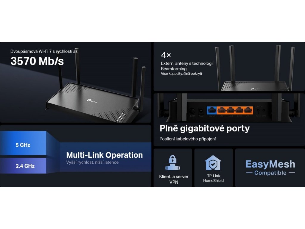 - Technologie Wi-Fi 7 (802.11be) s pokročilými funkcemi 4K-QAM pro vyšší rychlost a efektivitu sítě