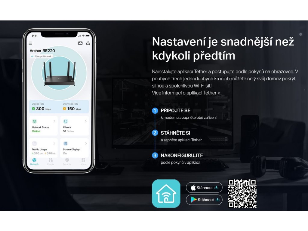 - Snadná správa přes mobilní aplikaci TP-Link Tether (Android/iOS)