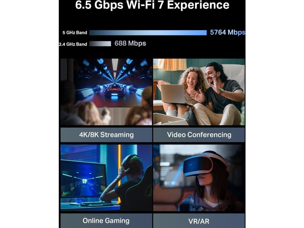 - Dvoupásmová technologie Wi-Fi 7 (802.11be) s rychlostí až 6,5 Gbps pro plynulé streamování 4K/8K videí a hraní AR/VR her