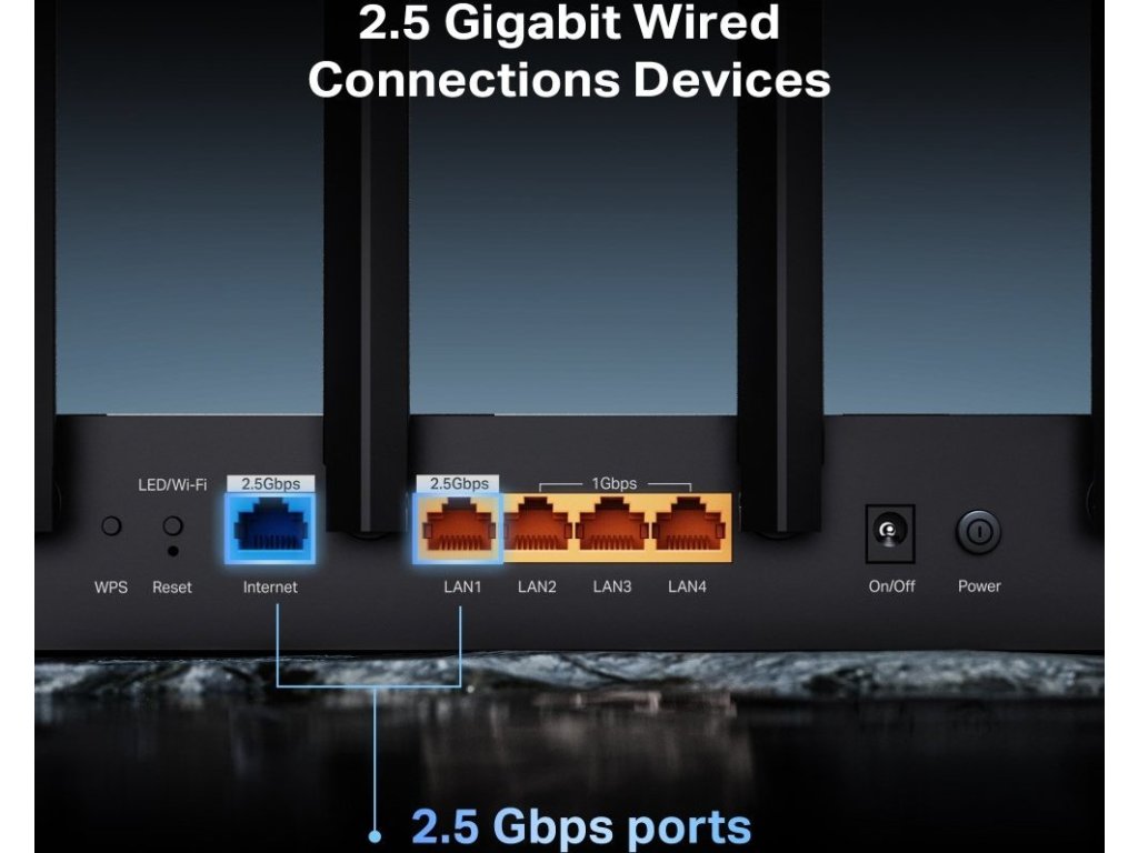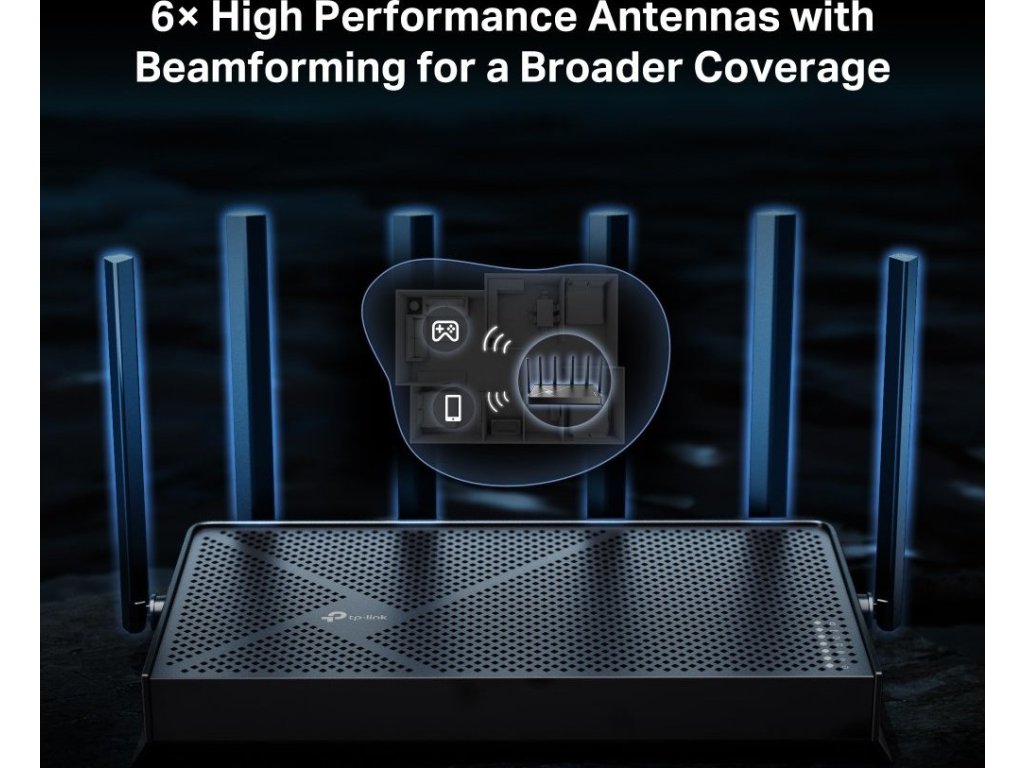 Router je vybaven dvěma 2,5Gbps porty (WAN a LAN), které překonávají omezení standardních gigabitových připojení a umožňují plně využít vysokorychlostní internetové připojení. Šest výkonných externích antén s technologií Beamforming zajišťuje široké pokrytí a stabilní signál v celé domácnosti.