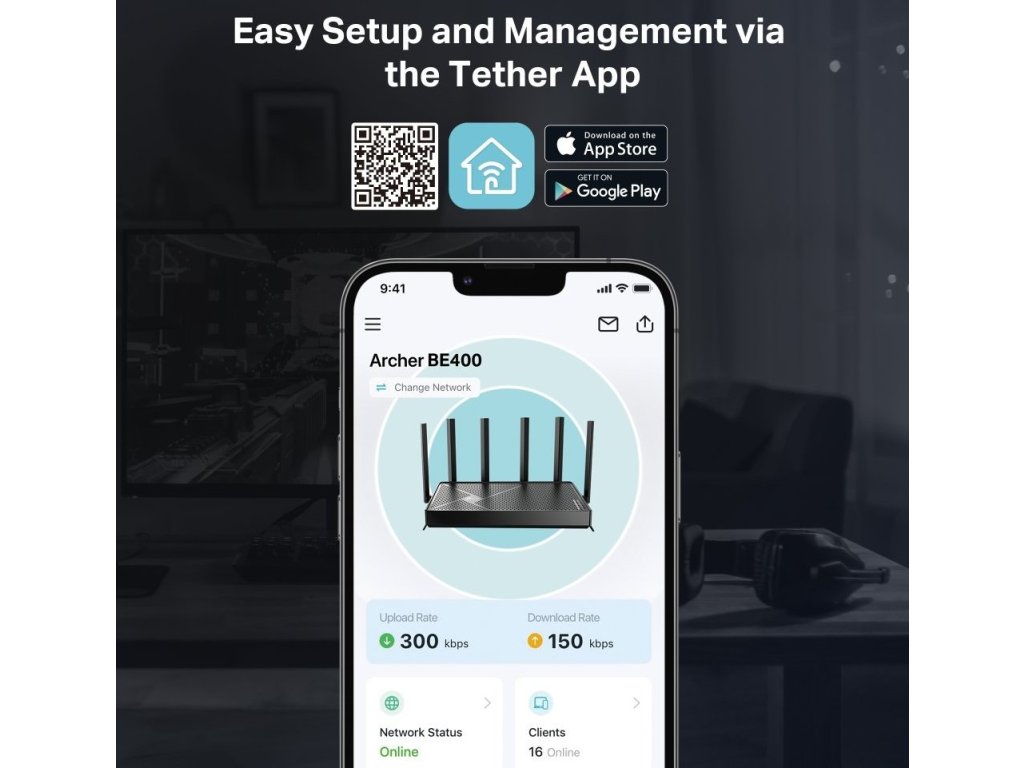 Router lze jednoduše spravovat pomocí aplikace TP-Link Tether dostupné pro Android a iOS. Služba HomeShield nabízí pokročilé funkce rodičovské kontroly pro správu času online a blokování nevhodného obsahu. Síťová ochrana dále udržuje domácí síť v bezpečí prevencí potenciálních hrozeb a bezpečnostních problémů.