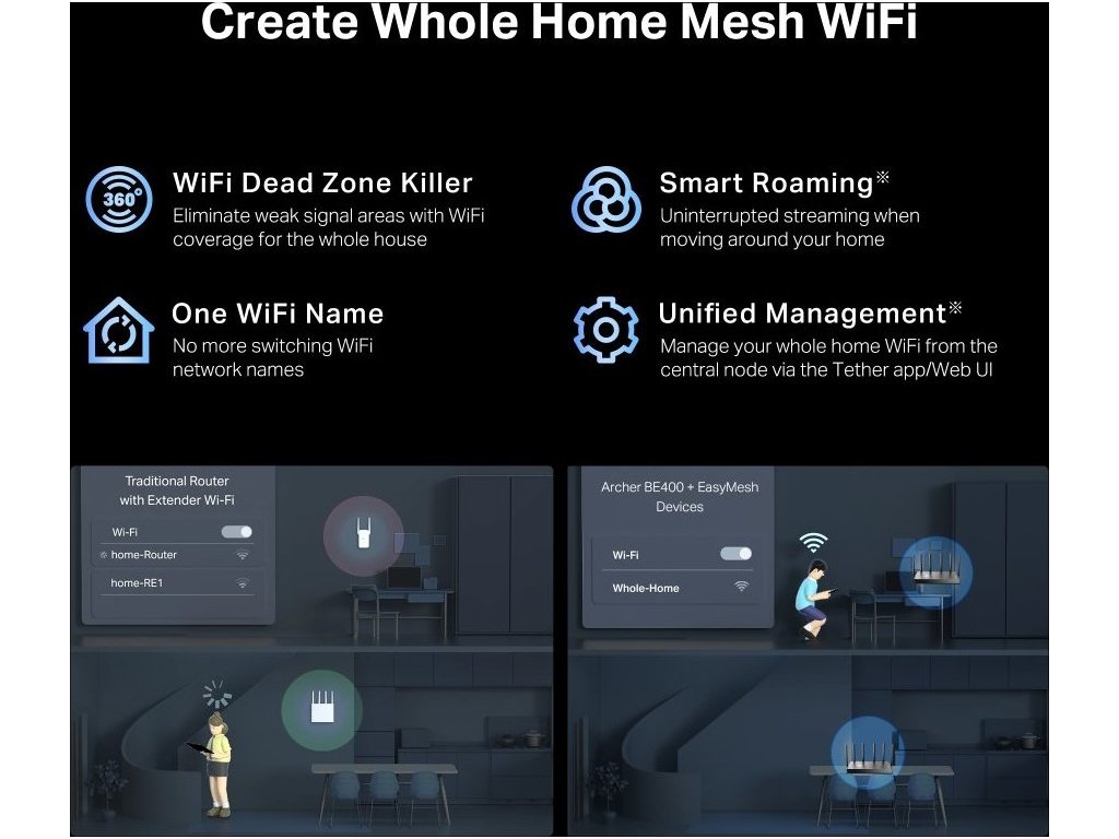 Archer BE400 podporuje různé režimy provozu včetně režimu přístupového bodu. Je kompatibilní s technologií EasyMesh pro vytvoření bezešvé celoplošné mesh sítě. USB 3.0 port umožňuje připojení externích úložišť pro rychlé sdílení souborů, fotografií a videí v rámci domácí sítě.