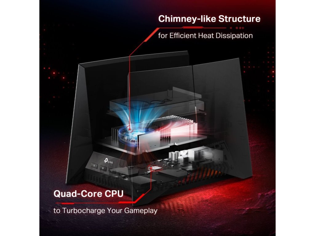 Router je vybaven výkonným čtyřjádrovým procesorem se 2 GB RAM, který zvládá masivní datové přenosy pro velké množství zařízení současně. Vyhrazené herní pásmo zajišťuje, že vaše herní zařízení nebudou nikdy bojovat o šířku pásma s ostatními zařízeními v domácnosti.