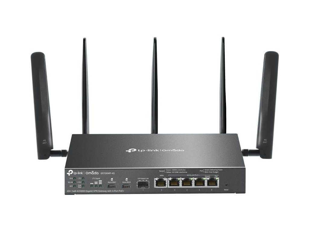 TP-Link ER706WP-4G Omada VPN Router, 2x Nano SIM, AX3000 WiFi 6, 1x SFP GWAN, 1x GWAN, 4x GLAN PoE+