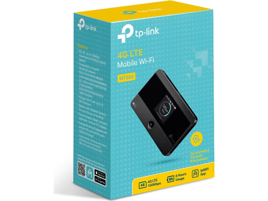Směrovač TP-LINK M7350 je špičkové zařízení pro sdílení v bezdrátových 4G sítích. Stačí do zařízení vložit 4G SIM kartu a okamžitě vytvořit volitelný dvoupásmový Wi-Fi hotspot. Směrovač M7350 dokáže díky rychlosti stahování 150 Mbit/s a uploadování 50 Mbit/s poskytnout možnost sdílení v 4G síti až 15 uživatelům najednou. Díky jeho kapesní velikosti a výkonné interní baterii s kapacitou 2550 mAh se z něj stává ideální zařízení na cesty, kdy uživatelům umožní až 10 hodin práce či hraní. Disponuje inovativním TFT displejem, takže uživatelé získají mnohem intuitivněji informace o provozním stavu zařízení, jako např. o síle signálu, typu sítě (4G/3G/2G), dostupnosti Wi-Fi, zprávách, internetu, statistikách provozu a stavu baterie.