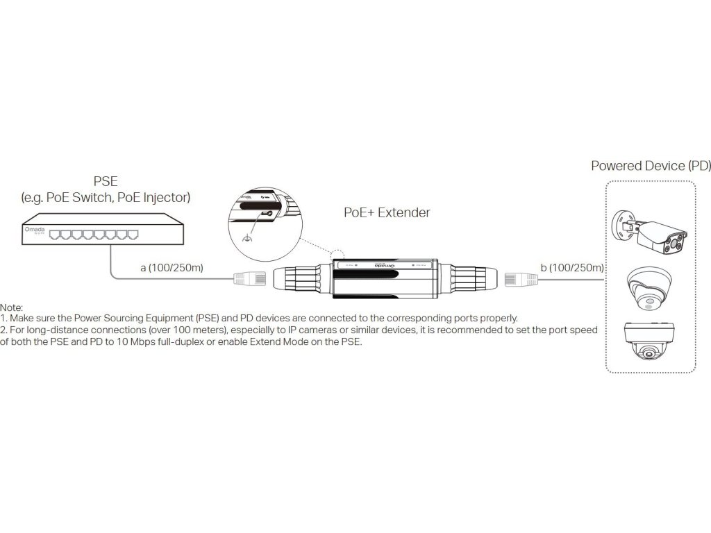 Ideální řešení pro místa, kde je potřeba překonat limity klasického PoE napájení. Dva gigabitové porty RJ45 umožňují přenos na plné 1Gb/s rychlosti, zatímco podpora 802.3af/at poskytuje až 30 W PoE+, což plně dostačuje pro většinu IP kamer, přístupových bodů či dalších síťových zařízení. Vysoká efektivita přenosu zajišťuje stabilní napájení i datový tok bez nutnosti dodatečných zdrojů. V long-range režimu se dosah zvýší ze standardních 100 až na 250 metrů, přičemž rychlost se sníží na 10 Mbps. Instalatéři kamer ocení, že tato rychlost pohodlně stačí pro spolehlivý přenos kompletního obrazu IP kamer, a moderní switche podporující long-range porty zajišťují stabilní a bezproblémovou síť.