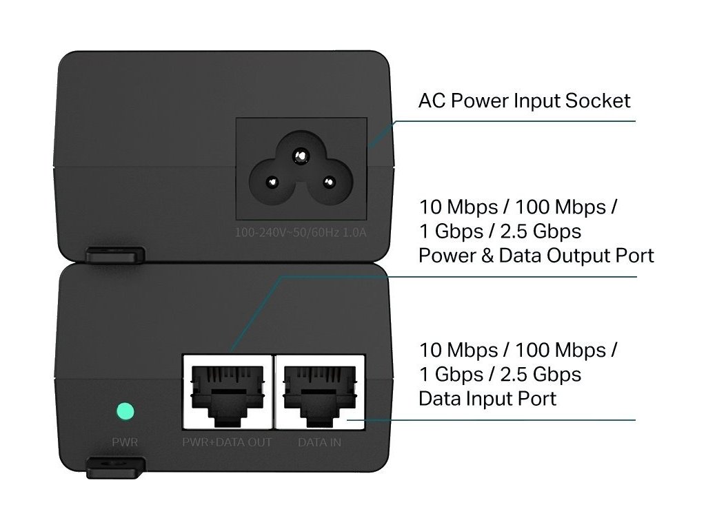 Porty: 1× 10/100/1000/2500 Mbps RJ45 data-in port, 1× 10/100/1000/2500 Mbps RJ45 power+data-out port, 1× AC napájecí konektor