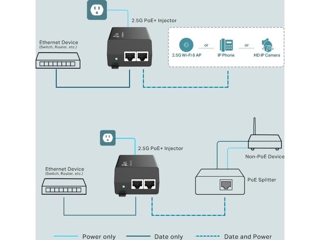 PoE+ injektor TL-POE260S umožňuje rozšířit síť do míst bez přístupu k elektrické zásuvce. Je ideální pro napájení zařízení jako jsou 2,5G přístupové body, HD IP kamery nebo IP telefony.