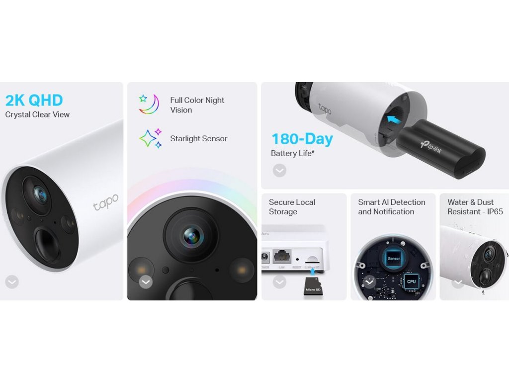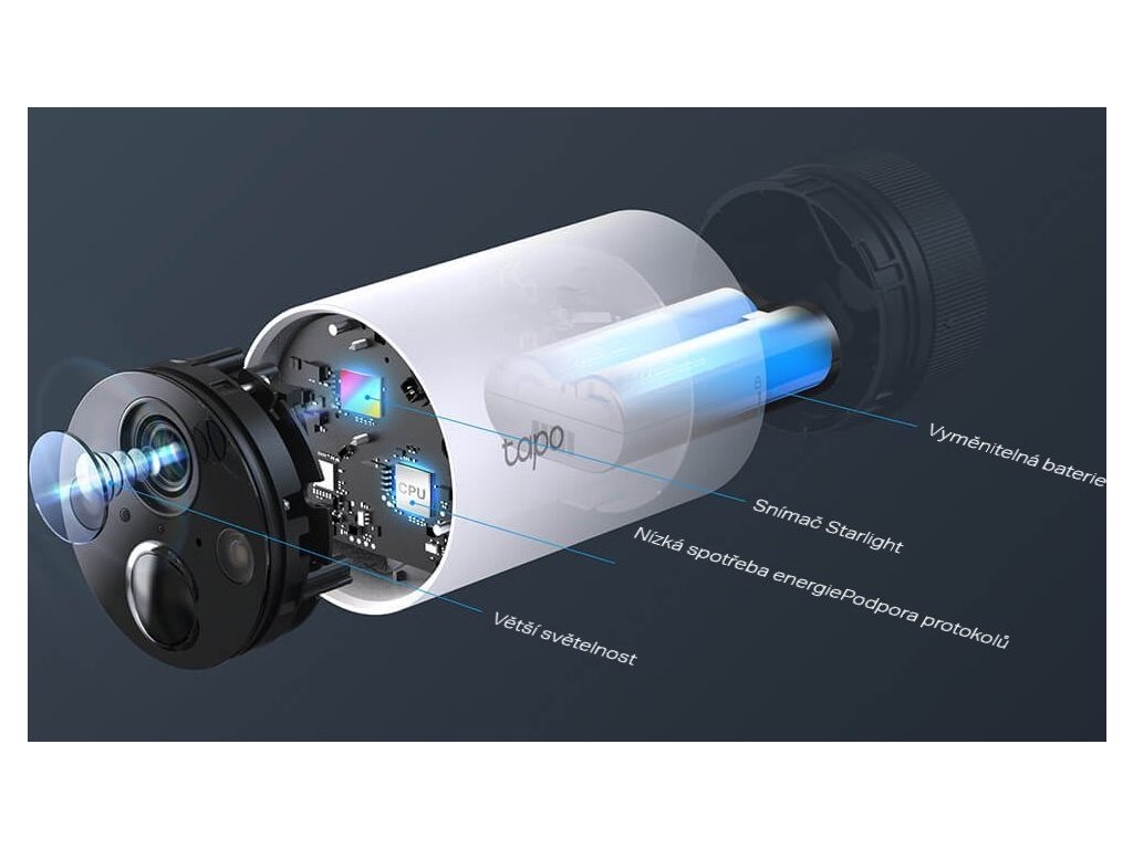 Vyměnitelný akumulátor lze dobíjet pomocí přiloženého USB adaptéru nebo volitelného solárního panelu Tapo A200. Bezdrátový design umožňuje umístění kamery prakticky kdekoli bez nutnosti kabeláže.