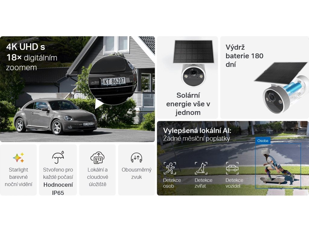 *Kamera rozpozná osoby, zvířata i vozidla a pošle vám rychlá upozornění — bez měsíčních plateb.