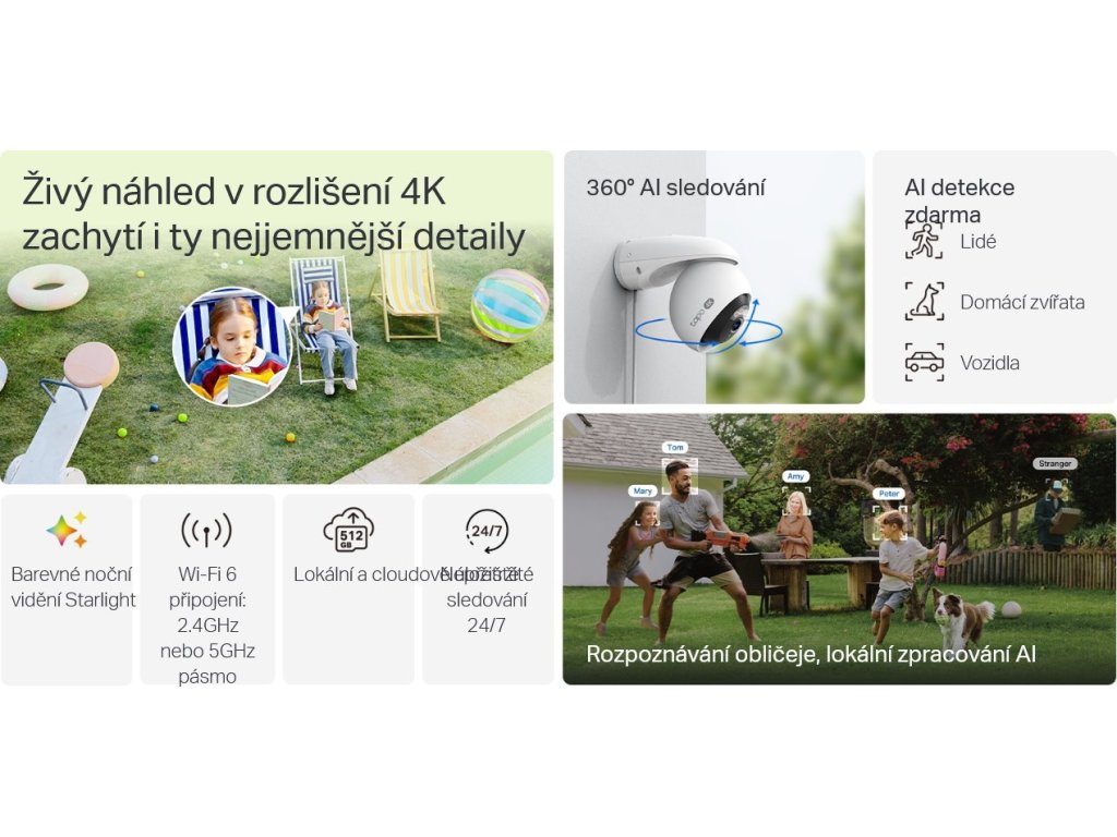 - 360° AI sledování osob, zvířat a vozidel s minimalizací falešných poplachů