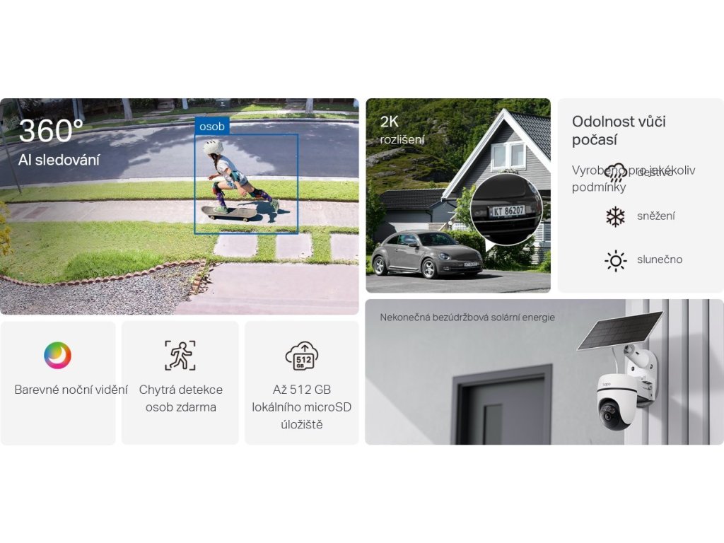 Úložiště: microSD slot (až 512 GB), cloudové úložiště Tapo Care