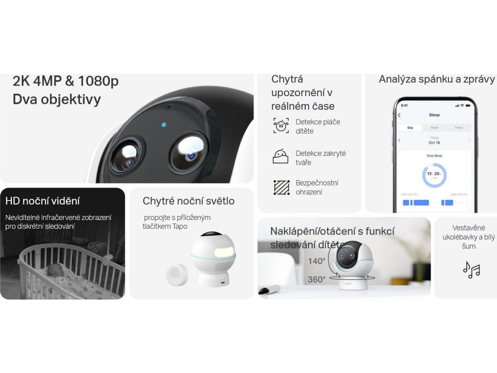 Inovativní kamera kombinuje teleobjektiv s rozlišením 1080p pro detailní záběry obličeje dítěte a širokoúhlý 4Mpx objektiv pokrývající celý dětský pokoj. Díky 360° otáčení a naklápění s inteligentním sledováním pohybu zůstane vaše dítě vždy v záběru, i když se pohybuje.