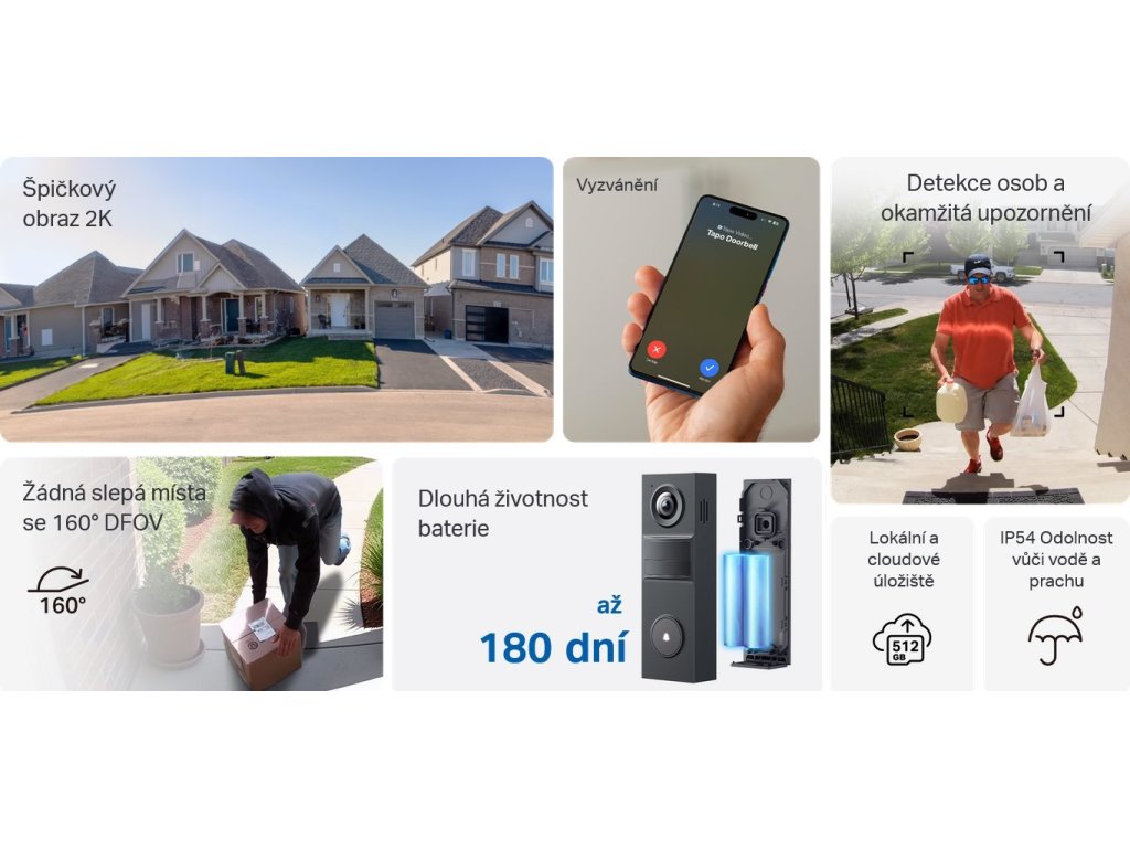 Zvonek podporuje pokročilou detekci osob pomocí AI, která eliminuje falešné notifikace způsobené pohybem zvířat nebo předmětů. Dvoucestná komunikace s potlačením šumu umožňuje plynulou konverzaci s návštěvníky. Díky IP54 certifikaci odolává nepříznivým povětrnostním podmínkám při teplotách -20 °C až +45 °C.