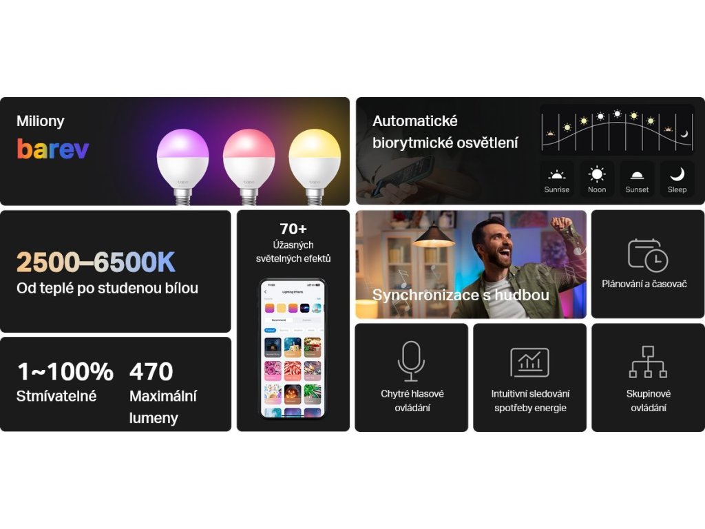 * Pomocí aplikace Tapo synchronizujte chytrou žárovku s hudbou a vytvořte dynamický světelný zážitek.