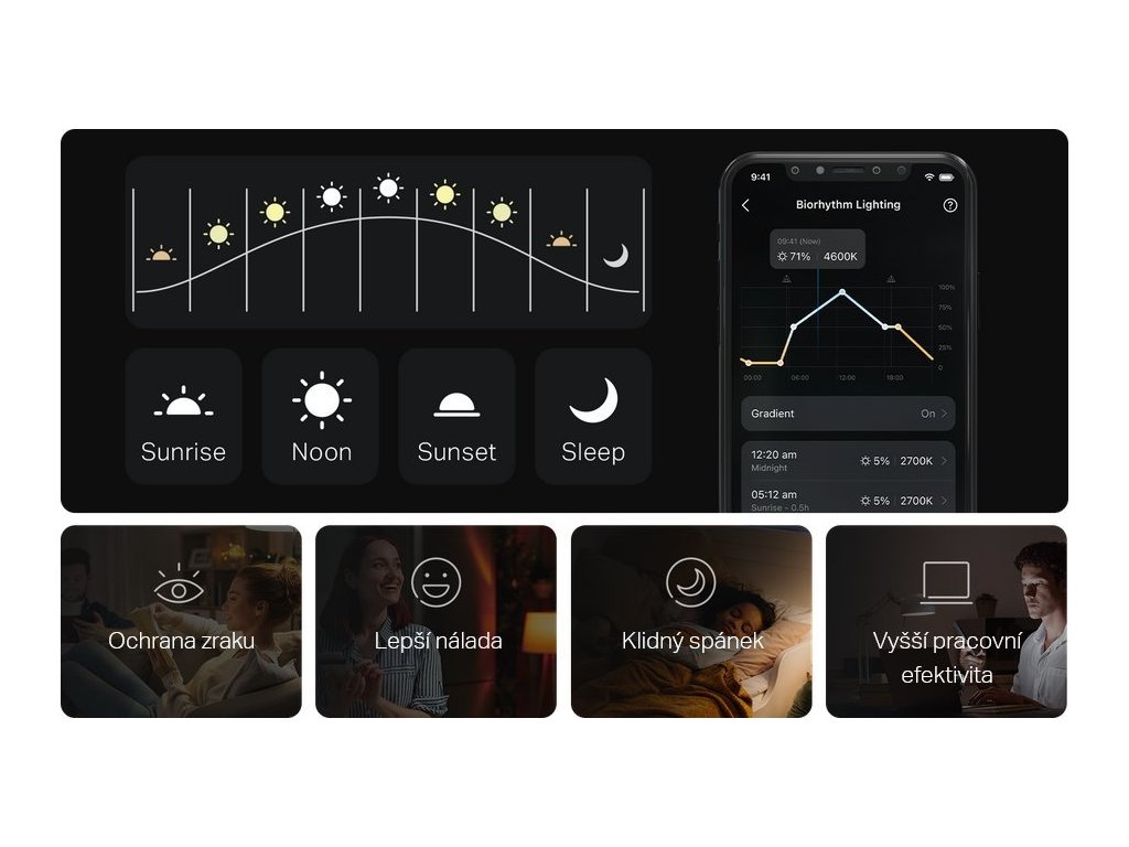 * Automaticky upravuje jas a barevnou teplotu podle přirozeného slunečního světla, aby bylo osvětlení vždy ideální.
