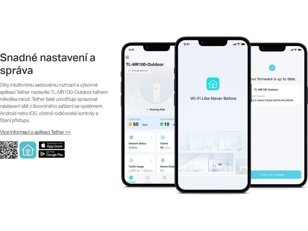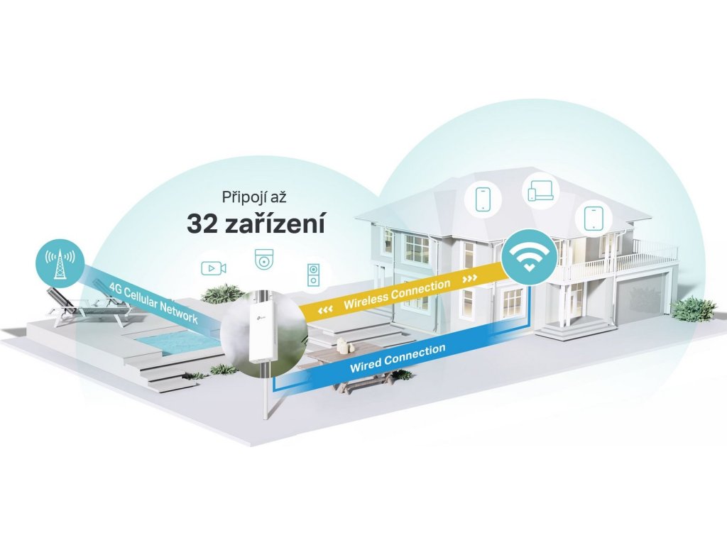 TP-Link TL-MR100-Outdoor je výkonný venkovní router s podporou 4G LTE sítí a Wi-Fi rychlostí až 300 Mbps. Díky robustnímu provedení s certifikací IP65 odolá nepříznivým povětrnostním podmínkám, prachu i vodě. Router umožňuje připojení až 32 zařízení současně a poskytuje stabilní internetové připojení pro domácnosti i firmy v lokalitách bez pevného internetu.