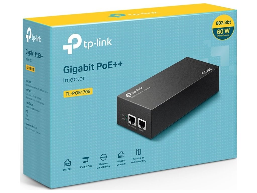 TP-Link TL-POE170SGigabitový PoE++ injektor plně vyhovuje standardům IEEE 802.3af/at/bt a poskytuje napájecí výkon až 60 W. Může snadno rozšířit vaši síť tam, kde není žádné elektrické vedení nebo zásuvka pro připojení zařízení, jako jsou PTZ IP kamery, Wi-Fi přístupové body, LED apod.