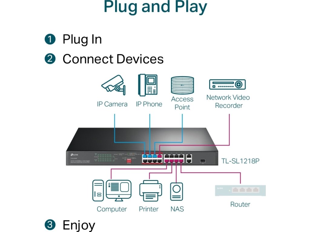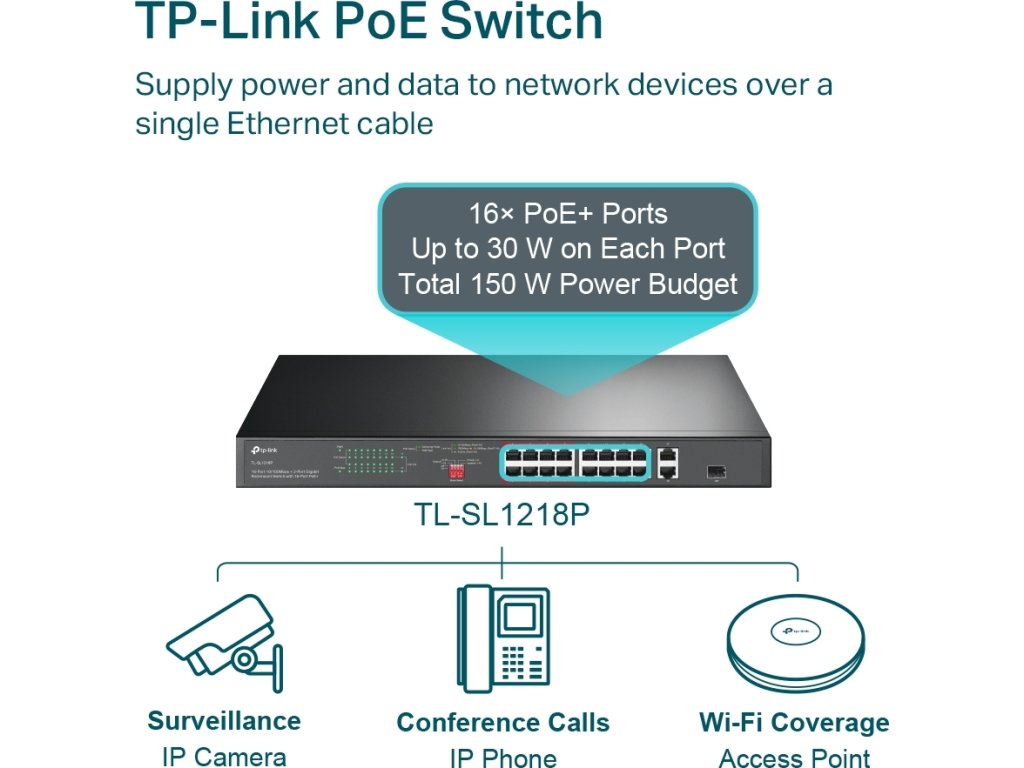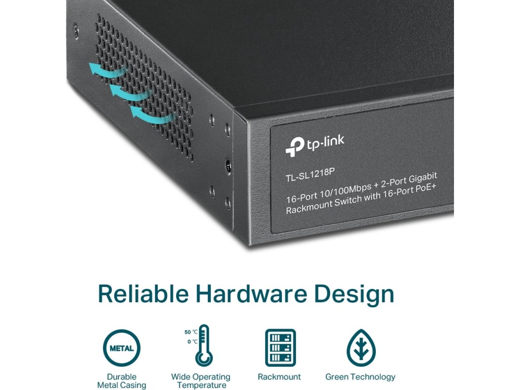 TP-Link TL-SL1218P 16-Port 10/100Mbps + 2-Port Gigabit Rackmount Switch s 16-Port PoE+.
