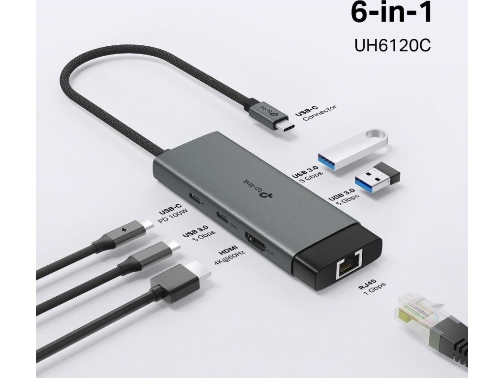 TP-Link UH6120C USB-C Hub na 1x USB-C, 1x HDMI 4K při 60Hz, 1x USB-C 100W PD, 2× USB-A, 1x GLAN