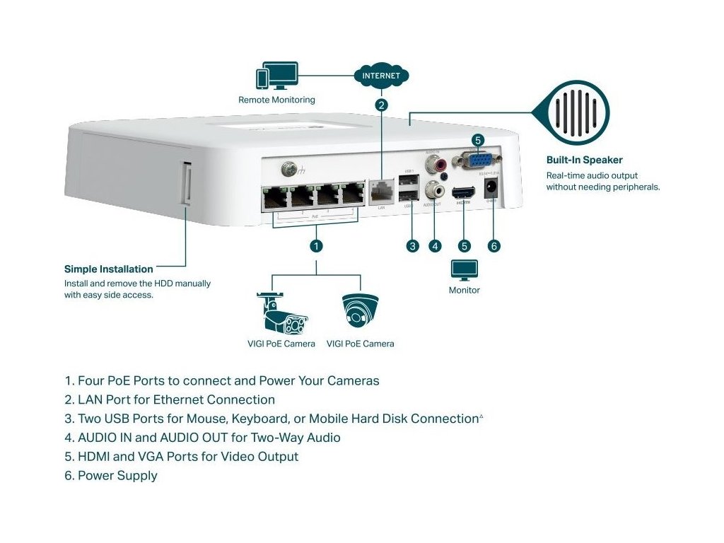 Porty: 1× HDMI výstup (4K), 1× VGA výstup, 1× RJ-45 (10/100 Mbps), 4× RJ-45 (PoE podpora), 2× USB 2.0, 1× audio vstup (RCA), 1× audio výstup (RCA)