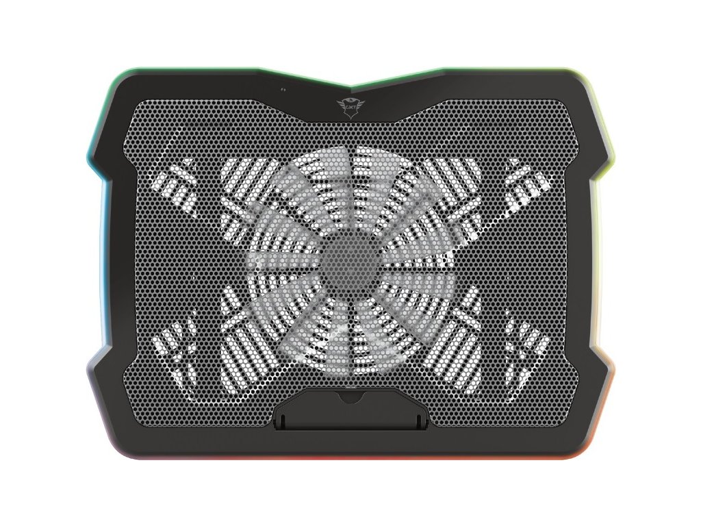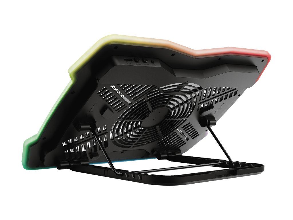 TRUST GXT 1126 Aura Multicolour-illuminated Laptop Cooling Stand. Vícebarevně osvětlený chladicí stojan, který udrží váš notebook v chladu i během těch nejnáročnějších her. Udržujte svůj notebook v chladu během horkých herních relací, zůstaňte v ergonomické poloze, abyste snížili zátěž na krk a záda. Doplňte svůj herní setup a zůstaňte v pohodě.