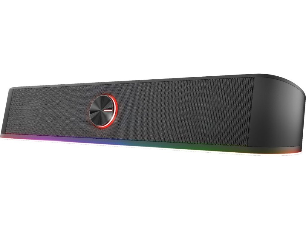 Trust GXT 619 Thorne RGB Illuminated Soundbar. Stereo soundbar s RGB osvětlením a designem šetřícím místo. Stereofonní reproduktory nemusí zabírat cenné místo na stole. Trust GXT 619 Thorne je herní soundbar v malém provedení. Čistý stereofonní zvuk s maximálním výkonem 12 W a osvětlením RGB činí z této zvukové lišty řešení pro každého hráče, který chce ušetřit nějaké místo, aniž by obětoval herní zážitek.