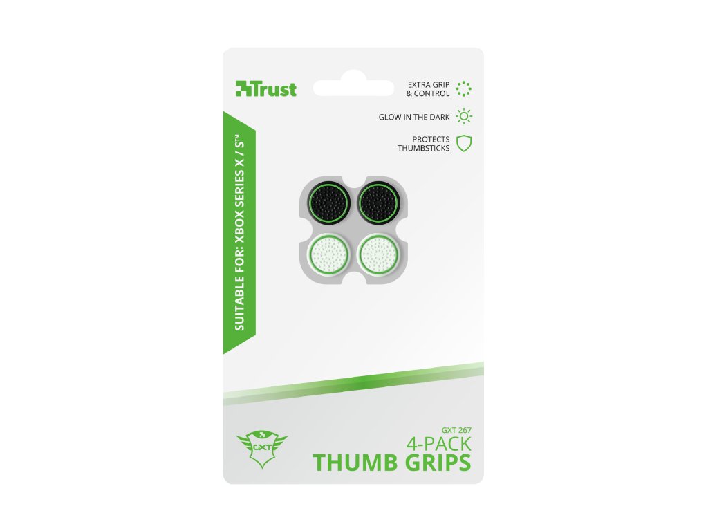 Trust GXT 267 4-pack Thumb Grips pro Xbox. Sada 4 palcových gripů pro váš ovladač Xbox Series X pro extra úchop a kontrolu. Máte novou konzoli Xbox Series X nebo Xbox Series S? Vítejte v hraní nové generace! Aby se vám váš nový ovladač dobře uchopil, jsou zde tyto Trust Thumb Grips. Tato sada má celkem 4 návleky z nichž dva svítí ve tmě, což vám pomůže udržet palce na analogových páčkách i v noci.