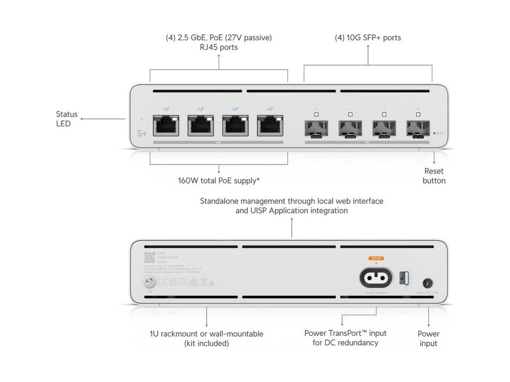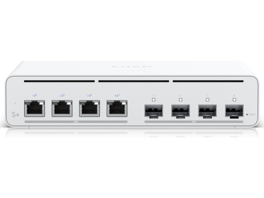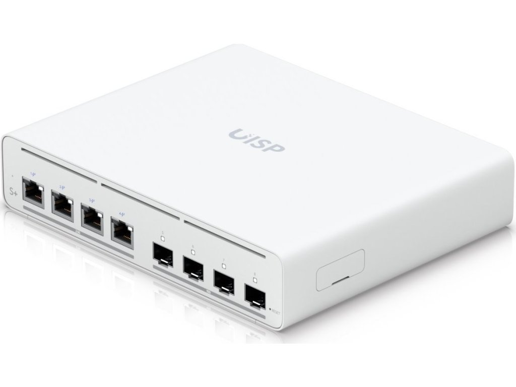 UISP-S-Plus je ideální switch pro nasazení mezi ISP poskytovateli. Jedná se o L2 PoE switch bez ventilátorů, s 4x 2.5 Gigabit LAN a 4x SFP/SFP+ porty pro další rozšíření pomocí optického vlákna. UISP Switch je cenově výhodné řešení pro menší centrální uzel s menším počtem zařízení s 2.5 a 10 Gbps. S celkovým 160 W PoE budgetem a maximálně 40 W / port (4 páry vodičů) nebo 20 W / port (2 páry vodičů) poskytuje switch značný výkon každému připojenému rádiu v PoE portech. Vyšší spolehlivost zaručuje redundantní napájení přes Power TransPort nebo DC konektor se vstupním napětím 27 V a proudem 7 A. Management je řešeno přes webové rozhraně nebo centrálně přes UISP aplikaci zajišťující správu všech vašich UISP zařízení.