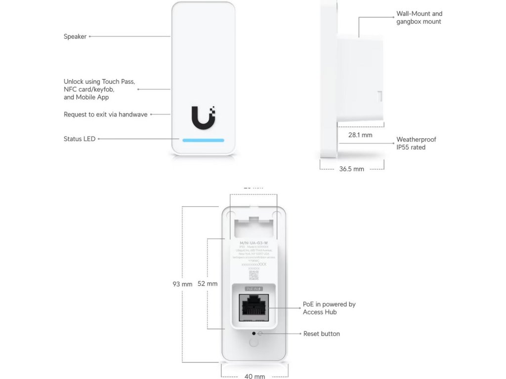 - Odemykání pomocí karty NFC, mobilní aplikace UniFi Identity nebo Touch Pass