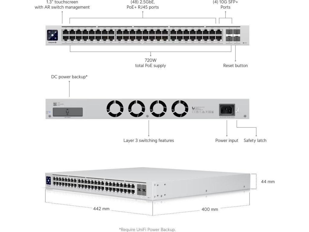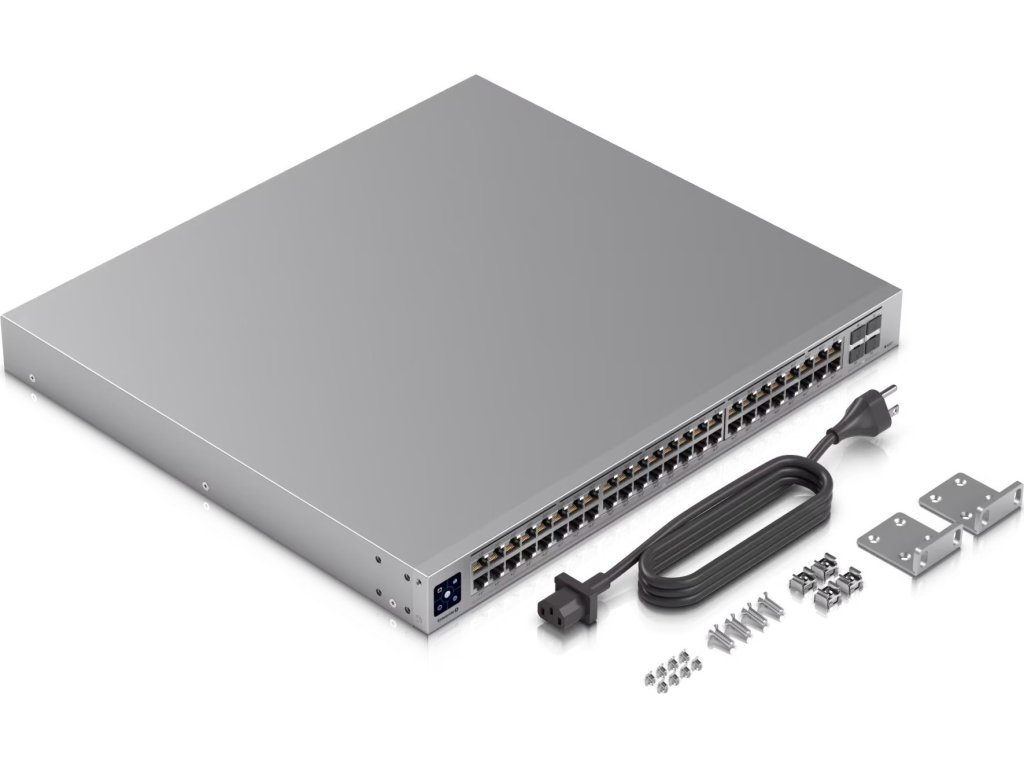 UniFi Switch Enterprise 48 PoE je spolehlivý managovatelný 2,5-Gigabitový L3 Switch s kapacitou přepínání 320Gb/s, (48) 2,5-Gigabit LAN porty a čtyřmi SFP+ (10Gbps) šachtami.