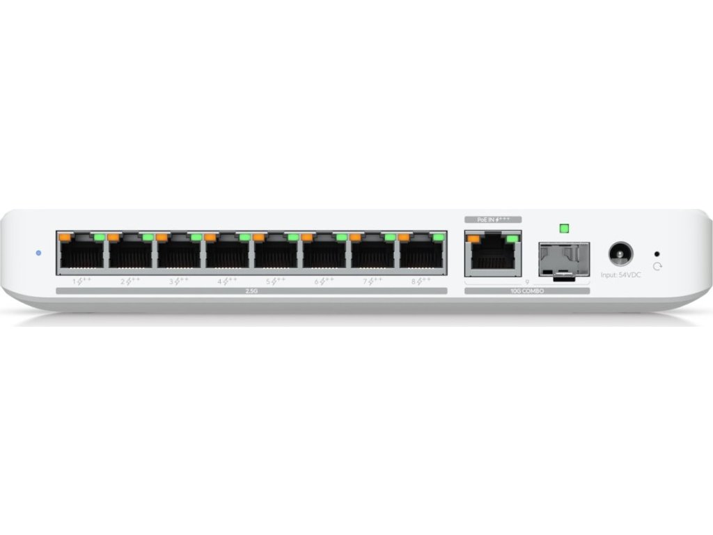 Flexibilní switch nabízející osm 2,5 GbE RJ-45 PoE++ portů a jeden kombinovaný 10G RJ-45/SFP+ pro uplink. Jedná se o L2 switch s celkovou kapacitou 60 Gbps, rychlostí směrování 44,64 Mpps a PoE budgetem až 196 W (v závislosti na typu napájení). Switch lze napájet buď přes DC konektor nebo pomocí PoE+++.
