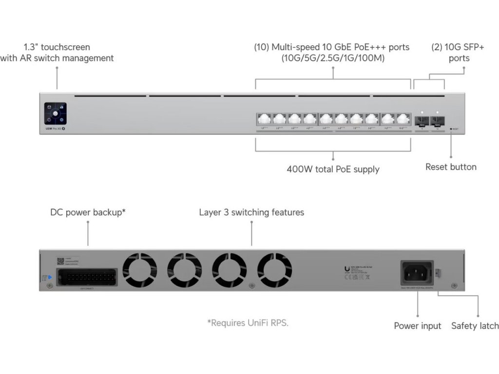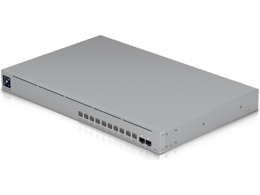 UniFi Switch Pro XG 10 PoE je rackmount managovatelný 10 Gigabitový L3 Switch s PoE, kapacitou přepínání 240 Gbps, (10) 10 Gigabit (podpora 802.3af/at/bt PoE) portů, dvěma SFP+ (1/10Gbps) šachtami a celkovým PoE budgetem 400 W. Switch lze napájet standardně přes 230 V ale také přes UniFi SmartPower RPS, který slouží spíše k zálohování napájení v případě selhání interního zdroje. Novinkou je Etherlighting barevné osvětlení portů indikující umístění portů, rychlost nebo indikaci VLAN.