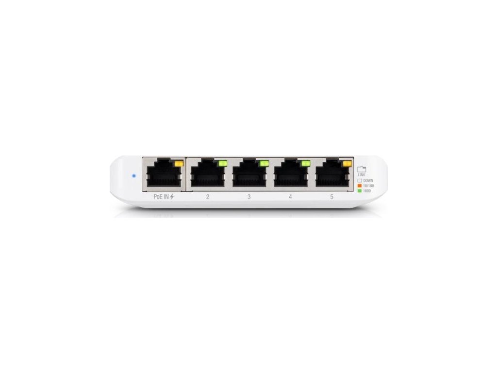 USW-Flex-Mini je maličký 5-portový Gigabitový switch se správou přes UniFi Network application od Ubiquiti v desktop provedení s prvním portem podporujícím PoE In.