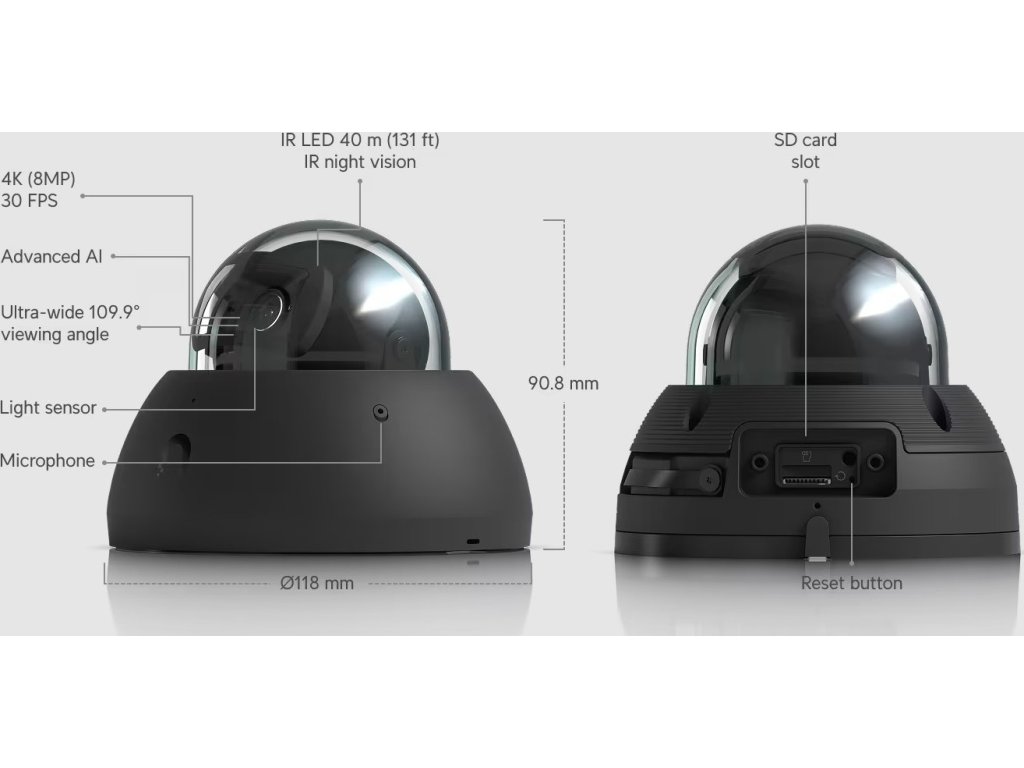 Kamera snímá 8 Mpx video (3840 x 2160) při 30 snímcích za sekundu s fixním 2,8mm objektivem.