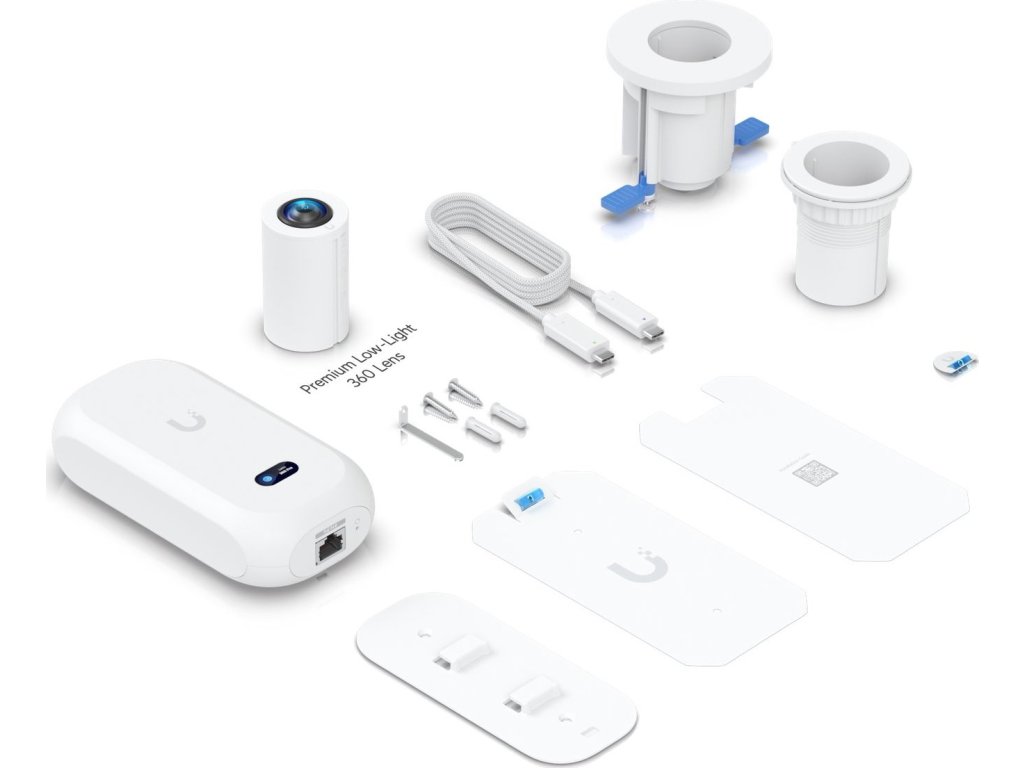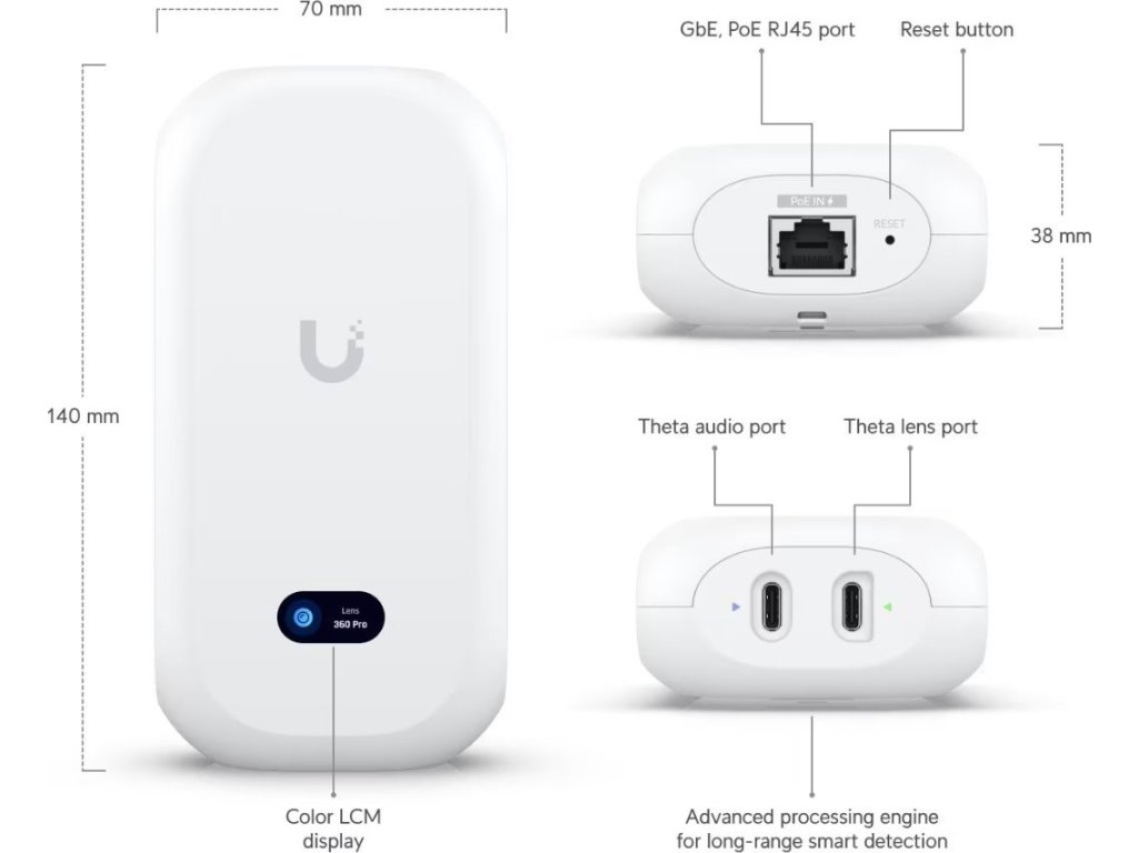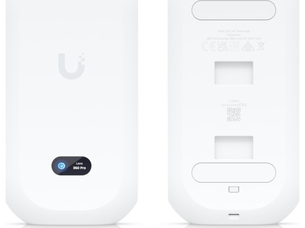 UniFi Protect UVC AI Theta Pro je speciální kamerová jednotka (hub) s Ethernetovým portem, informačním displejem a dvěma USB-C porty pro připojení kamery na vzdálenost až 30 m (v balení naleznete 1m propojovací kabel) a mikrofonu / reproduktoru, který není součástí balení. V balení se nachází stropní ultraširoká 360° kamera s 8 MP senzorem a maximálním rozlišením 2160 x 2160 px (4 MP) při 24 fps.