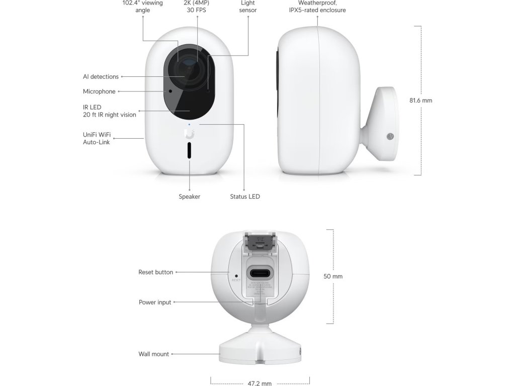UniFi Protect G4 Instant kamera disponuje 5MP snímačem (2688x1512px) při 30fps, fixním objektivem 2,8mm, IR přísvitem pro noční vidění, mikrofonem a reproduktorem. Kamera má robustní a kompaktní tělo z polykarbonátu, odolnost IK04 proti vandalům a krytí IPX5 proti tryskající vodě. Do sítě se kamera připojuje pomocí Dual-Band WiFi s podporou standardů 802.11a/b/g/n/ac a napájení je řešeno přes USB-C kabel (5V/2A) s maximální spotřebou 6W.